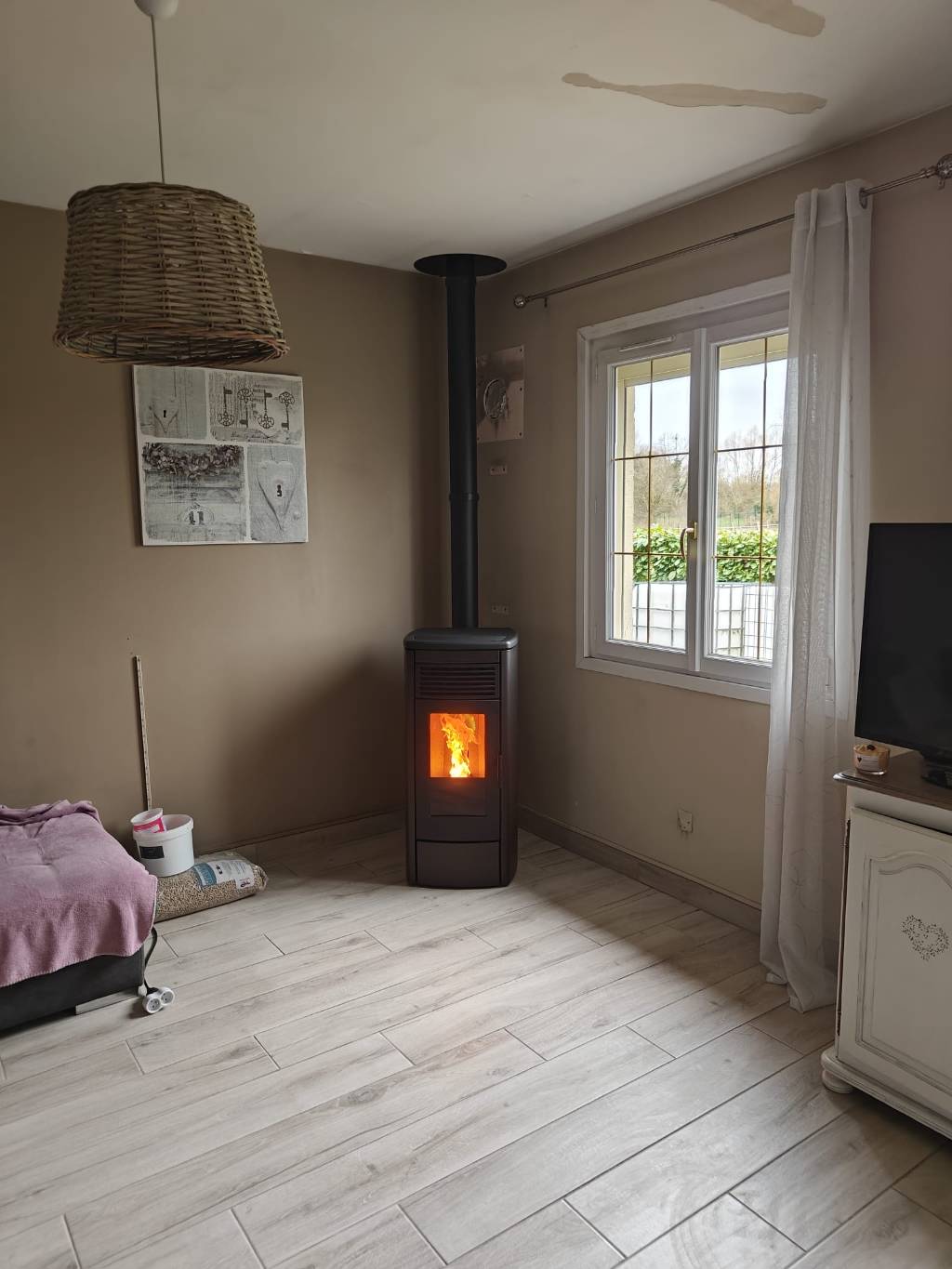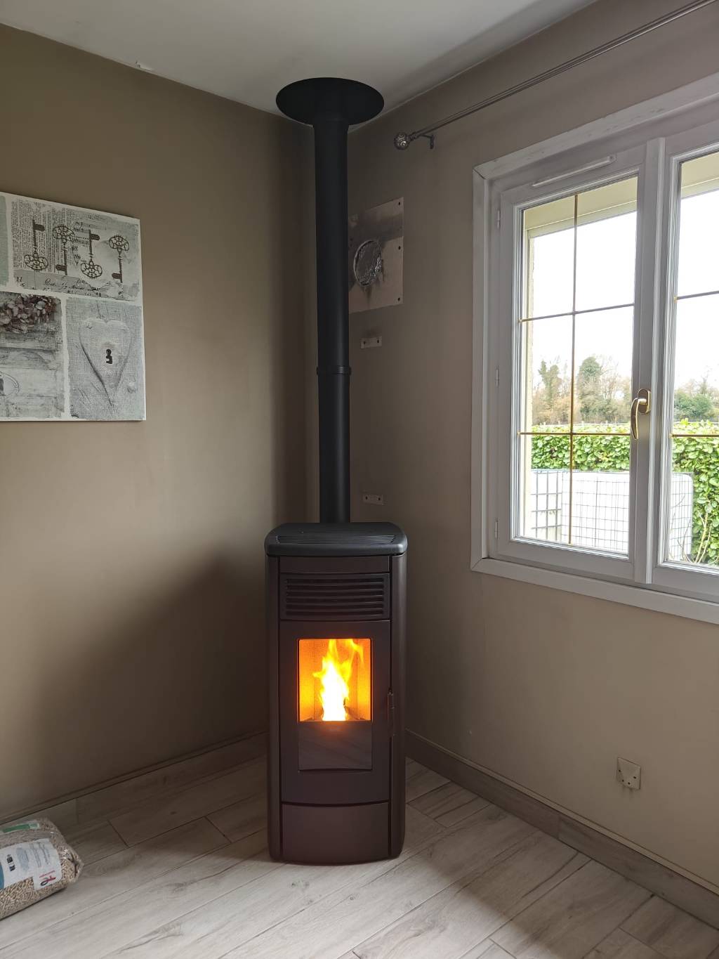 Remplacement d'un poêle à granulés qui commençait a montrer des signes de défaillances par un poêle plus actuel ayant une télécommande faisant office de thermostat d'ambiance et également le wifi intégré pour pouvoir le piloter à distance.